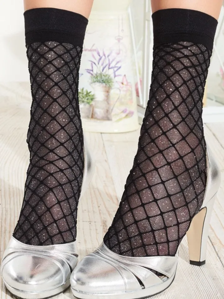 Die Söckchen Snapdragon von Trasparenze sind aus schwarzem Netz gestrickt und mit Glitzerfaden unterlegt. Die Netzsöckchen schimmern in metallisch gold.