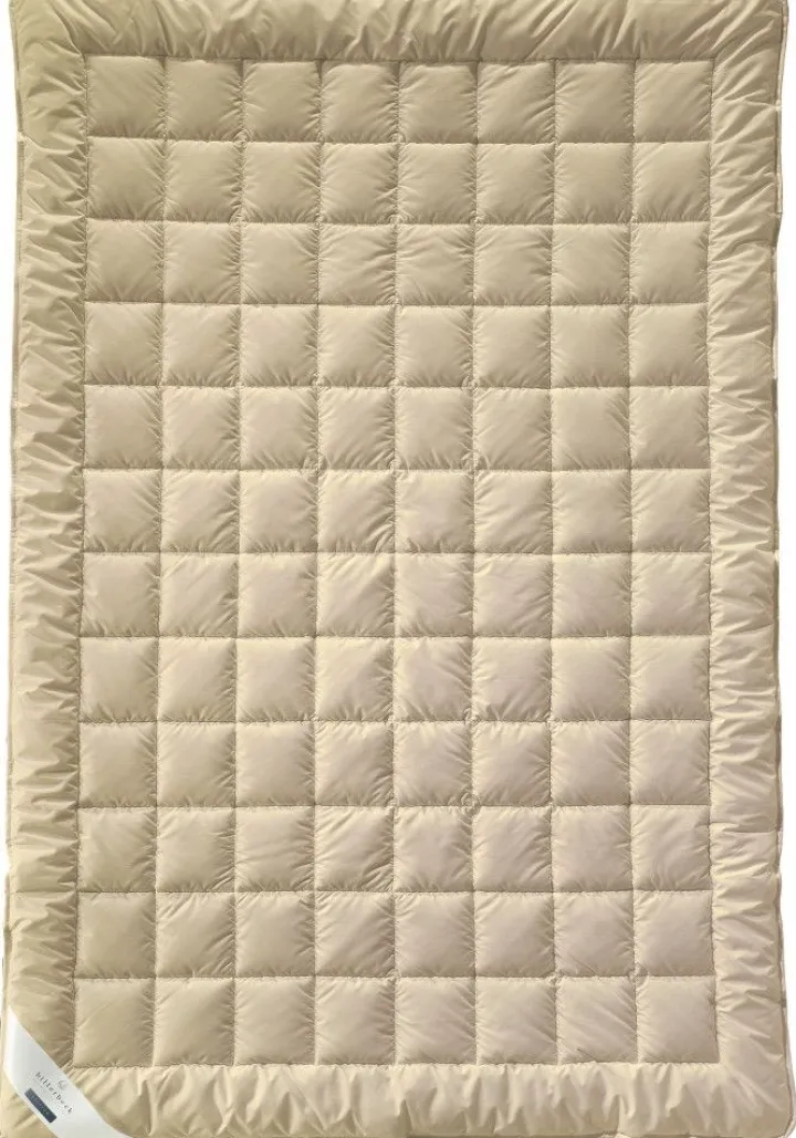 Der Oberstoff aus 100% Baumwolle ist ein feiner Baumwoll-Satin oder Baumwoll-Perkal, welcher für eine gute Anschmiegsamkeit sorgt. Die Decken sind sommerliche Decken mit nur 1 bis 2 Wärmepunkte (von 5).