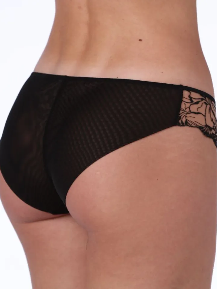 Der schicker Slip Ashley von Ritratti ist aus einer schwarzen floralen Spitze auf einem creme-/hautfarbenen Tüll gefertigt (Tüll: 82% Polyamid und 18% Elasthan, Spitze: 75%Polyester, 25% Elasthan). Der Slip hat einen Innenzwickel aus einem Baumwolljersey (100% Baumwolle).
