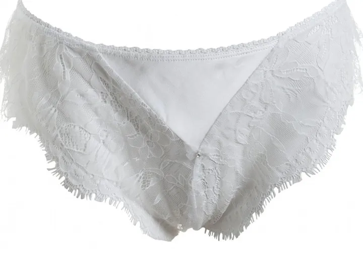 Dieser raffinierte Slip besteht fast vollständig aus halbtransparenter Blüten-Spitze. Auf der Vorderseite ist ein schmückender Einsatz aus Seidensatin eingearbeitet. Auch der Innen-Zwickel besteht aus diesem Material. In der Farbe rot wird die Vorderseite von einem zierlichen Schleifchen geschmückt, bei den champagner-weißen Slips ist ein funkelnder Schmuckkristall eingearbeitet.