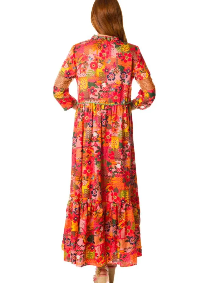 Das lange Strandkleid Kate der italienischen Luxus-Marke Laetitia Beachwear ist aus feinem Batist (65% Baumwolle, 35 % Seide) gefertigt. Das exklusive Kleid ist in einem Mustermix mit floralen Mustern gearbeitet und in echter Handarbeit mit Häkelsäumen verziert. Der V-Ausschnitt ist mit Häkelsäumen umhäckelt.
