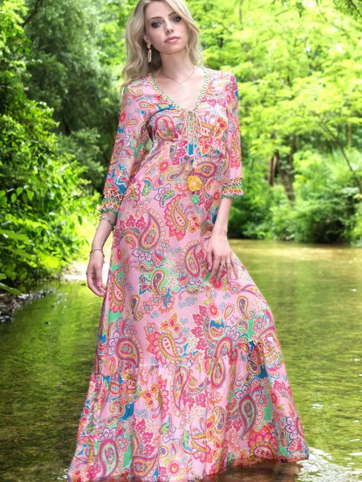 Das lange Strandkleid Berenice Lyra der italienischen Luxus-Marke Laetitia Beachwear ist aus feinem Batist (65% Baumwolle, 35 % Seide) gefertigt. Das exklusive Kleid ist in einem Mustermix mit floralen und Paisley-Mustern gearbeitet und in echter Handarbeit mit Häkelsäumen verziert. Der Ausschnitt ist umhäkelt ebenso wie die Ärmelenden der halblangen Ärmel.