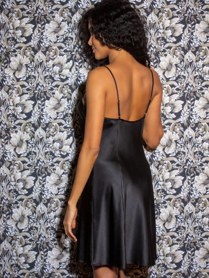Das kurze Seidennachthemd Oxana der französischen Edel-Marke Marjolaine ist aus feiner Stretchseide (92% Seide, 8% Elasthan) gefertigt. Die feinen Spaghetti-Träger sind hinten verstellbar und die Büste ist durch kleine, seitliche Abnäher leicht ausgearbeitet.