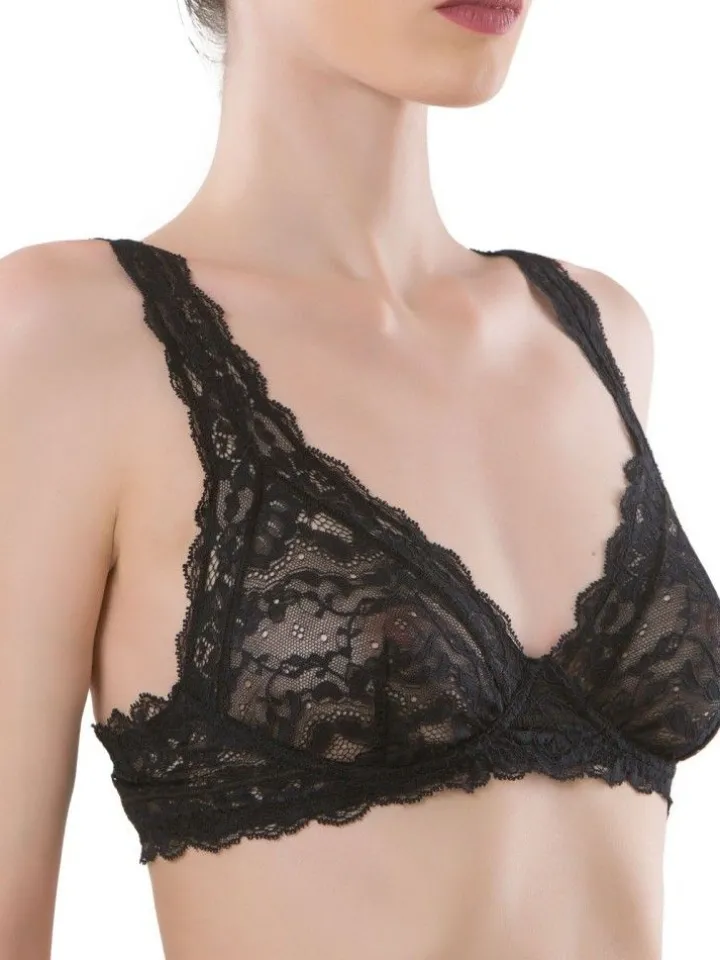 Die weichen Triangel-Cups ohne Bügel sind ungefüttert und insgesamt leicht transparent. Die Cups sind aus edler Leavers Spitze gefertigt. An den Seiten besteht der BH ebenfalls aus der elastischen Spitze und im Rücken wird er mit einem doppelten, 4-fach verstellbaren Häkchenverschluss geschlossen.