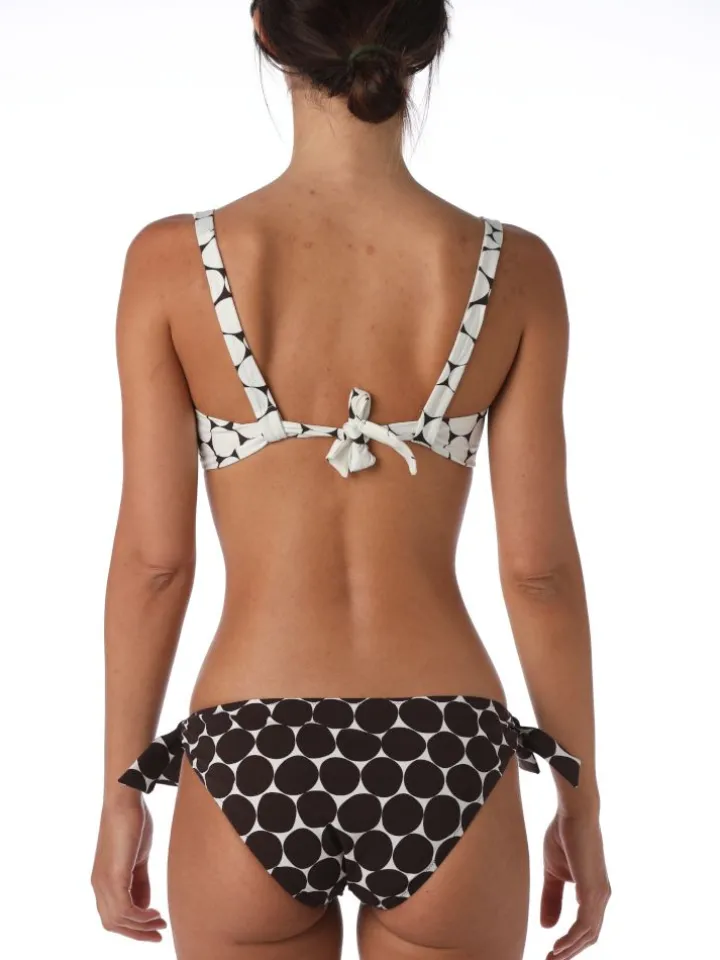Die Bademoden von Ritratti Mare vereinen ausgefallene Stoffe und eine edle Verarbeitung mit einem eleganten, italienischen Design. Der Triangel-Bikini Boracay von Ritratti Mare ist aus zwei angenehmen Mikrofaserjerseys (80% Polyamid, 20% Elasthan und 90% Polyamid, 10% Elasthan) gefertigt. Der Bikini ist gepunktet. Das Bikini-Oberteil ist weiss gepunktet und das Höschen schwarz. Der Bikini ist unwattiert und hat keine Bügel, aber seitliche Stützstäbchen. Das Höschen kann man beidseitig binden.