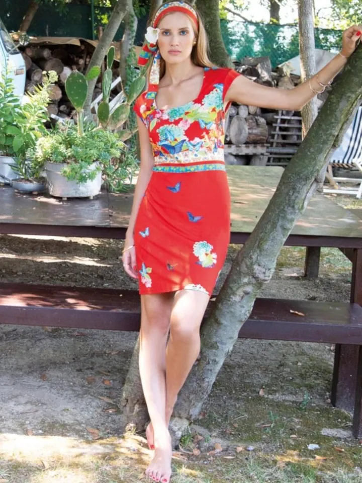 Das kurze Strandkleid mit kurzen Ärmeln von Chiara Fiorini besteht aus Viscose in einer hautsympathischen, elastischen Jersey-Qualität (95% Viscose, 5% Elasthan). Es ist Made in Italy und in in den Größen 36 bis 46 erhältlich. Ausverkaufte Größen sind hier nicht nachbestellbar. Dieses Strandkleid ist ca. 95 cm lang, mit eckigem Ausschnitt. Das kurze Kleid hat kurze Ärmelchen, einen platzierten Druck und ist geradlinig geschnitten. Der Saum hat auf der Rückseite einen Schlitz.