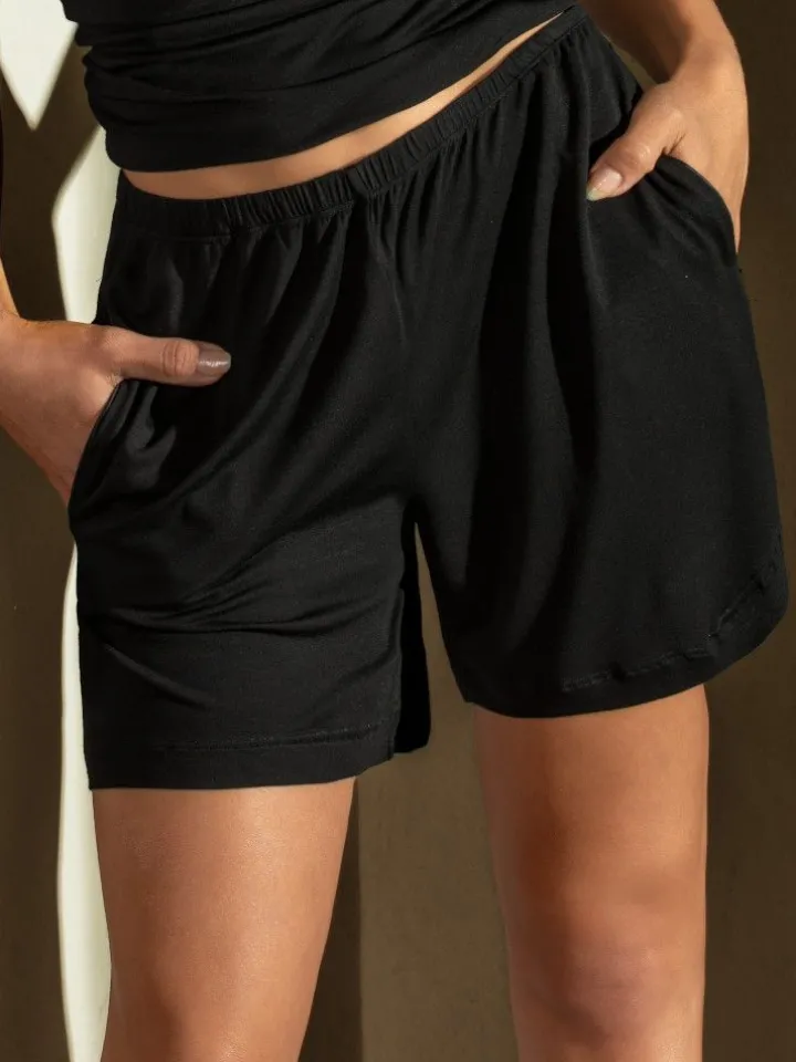 Die Hose in hellblau oder schwarz ist seitlich mit Taschen gearbeitet. Die Damenshorts ist mit einem Gummibund gearbeitet.