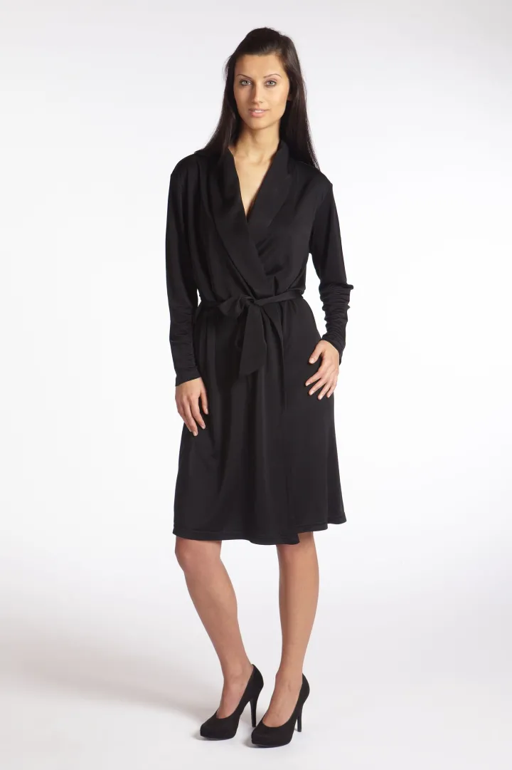 Dieser kurze Wickelmantel mit Bindegürtel ist die optimale Ergänzung zu den Nachthemden und Seidenwäsche- Teilen der Gattina Kollektionen Moyenne, Tahiti, Andaman und Interlaken. Der Langarm- Morgenmantel ist aus fließender feiner Wirkseide (100% Seide) hergestellt. Das trageangenehme Material mit einem Flächengewicht von 150 g/m² trägt sich wie feiner Jersey, ist durch die spezielle Strickart aber wesentlich haltbarer.