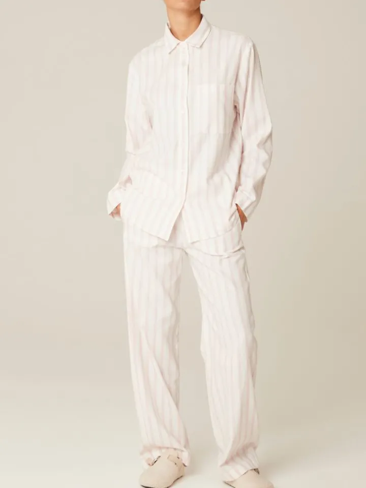Dieser hautsympatische Pyjama Janica von Pluto ist aus einem angenehmen weißen Flanell mit pinken Streifen (100% Baumwolle) gefertigt. Der lange Pyjama besteht aus einem Oberteil mit Knopfleiste am Ausschnitt und einer langen Hose mit Taschen. Der Ausschnitt des Oberteils ist öffenbar. Zusätzlich ist am Oberteil noch eine Brusttasche angebracht und das Obertei hat einen Polo-Kragen. Dieses Set eigent sich perfekt als Loungewear für Zuhause oder auch als Pyjama.