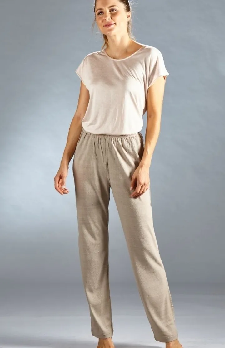 Das Grundmaterial dieser Serie ist ein blickdichter Strick, der sehr weich und angenehm zu tragen ist. Er wirkt temperaturausgleichend, knittert kaum und trocknet schnell. Seide temperiert im Winter und ist angenehm luftig im Sommer, weshalb Seidenwäsche für jede Jahreszeit geeignet ist. Außerdem ist dieses edle Material leicht elastisch und passt sich daher an die Körperkontur an. Die Hose hat einen Gummizugbund oben und gerade geschnittene Beine ohne Bündchen unten.