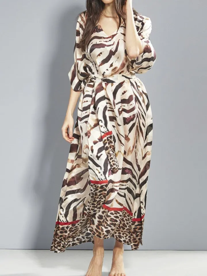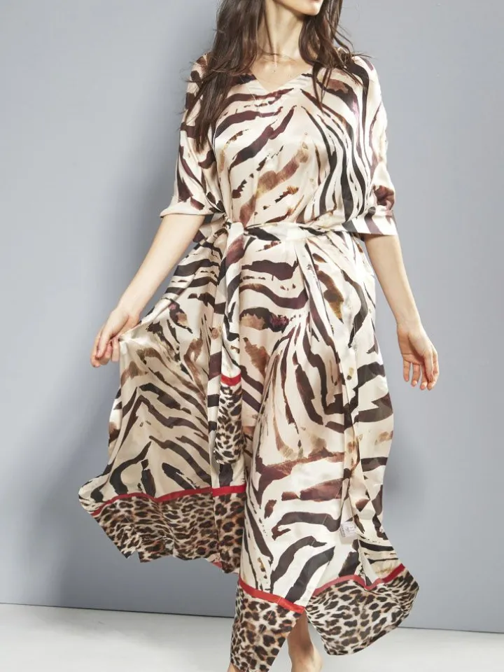 Langer Seiden Kaftan mit einer Neuinterpretation von Animal Print. Das verfremdete Zebramuster ist als platzierter Druck auf einem Seidensatin aus 100% Seide ausgeführt, wodurch dieser Seidenkaftan besonders edel wirkt. Der Kaftan hat einen V-Ausschnitt und kann mit dem zugehörigen Bindegürtel zu einem bequemen Hauskleid oder Sommerkleid drapiert werden.