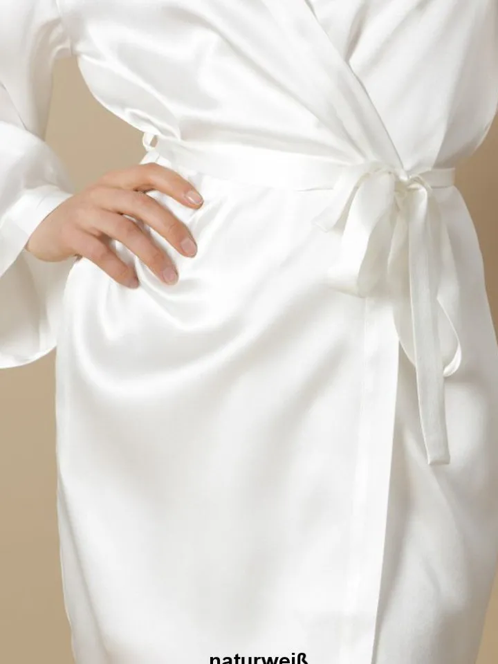 Dieser kurze Seiden-Morgenmantel ist ca. 90 cm lang. Er wird in den Größen 36 bis 46 angeboten (deutsche Damengrößen) und ist in den folgenden Farben erhältlich: