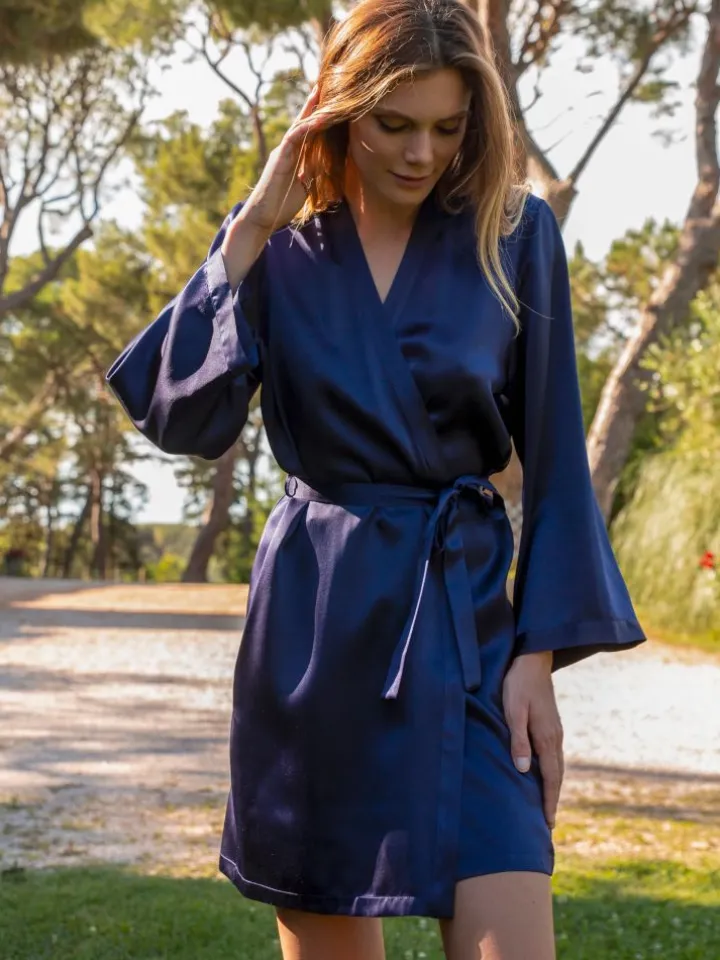 Der kurze Seiden-Morgenmantel Laser der französischen Edel-Marke Marjolaine ist aus feinem Seidensatin (100% Seide) gefertigt. Der hochwertig verarbeitete kurze Morgenmantel ist die perfekte Ergänzung zu den Seiden-Nachthemden und Negligés von Marjolaine.