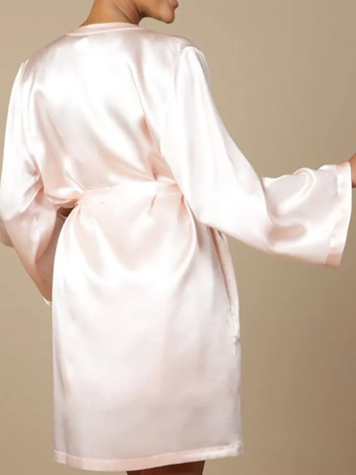 Dieser kurze Seiden-Morgenmantel ist ca. 90 cm lang. Er wird in den Größen 36 bis 46 angeboten (deutsche Damengrößen) und ist in den folgenden Farben erhältlich: