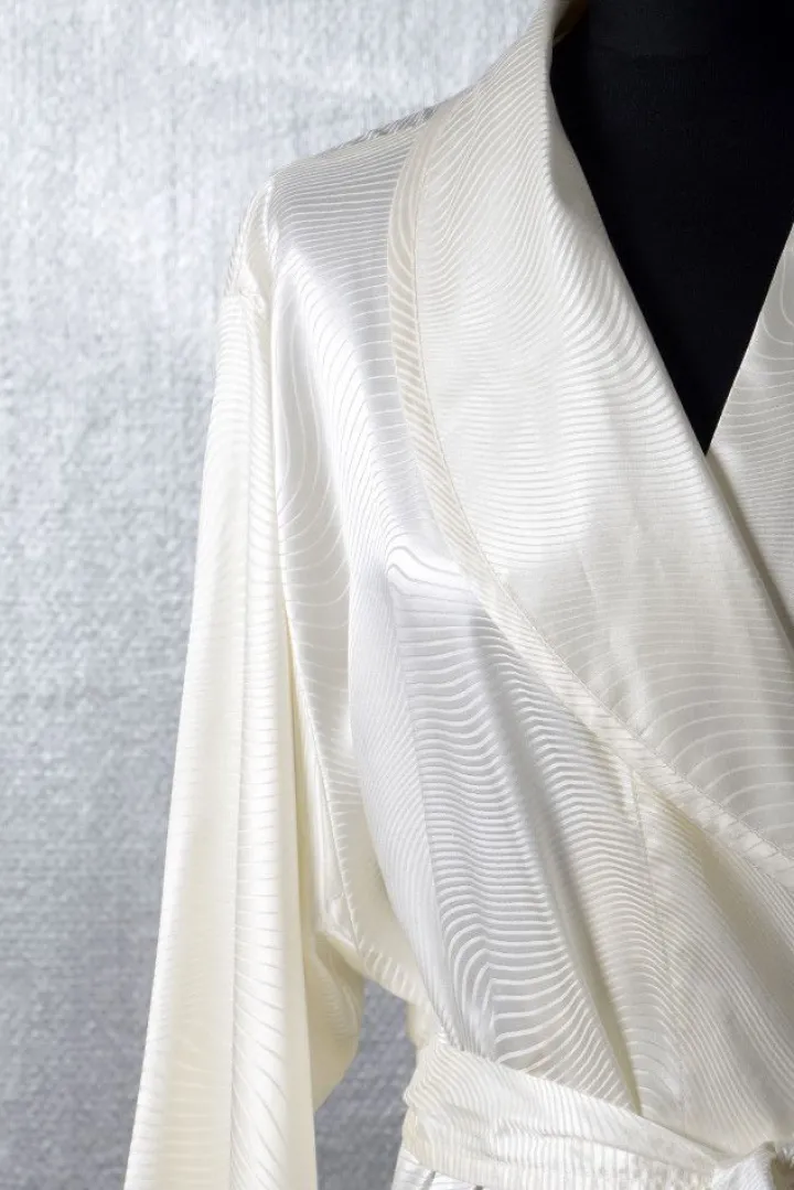 Der hochwertige Morgenmantel Welle besteht aus reiner Seide. Er hat ein modernes, wellenförmiges Streifenmuster, welches in den Stoff eingewebt ist. Das hochwertige Gewebe aus 100% Seide fällt fließend und hat einen seidigen Glanz. Nachtwäsche aus reiner Seide ist hautsympathisch und temperaturausgleichend und damit sowohl im Sommer als auch im Winter angenehm. Mit einem Flächengewicht von etwa 110 g/m² ist dieser Morgenmantel aus Seide edel und luxuriös