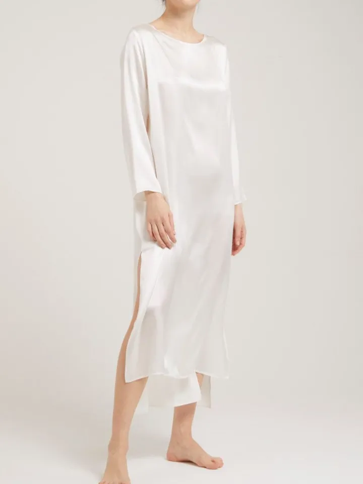 Dieses elegante Seiden-Nachtkleid ist aus hochwertigem Seidensatin (100 % Seide) gefertigt. Das lang geschnittene Seidenkleid ist hinten etwas länger geschnitten als vorne und seitlich auf beiden Seiten hoch geschlitzt. Es ist in klassischen Uni Farben erhältlich, wie z.B. sangria rot, nachtblau oder naturweiss.