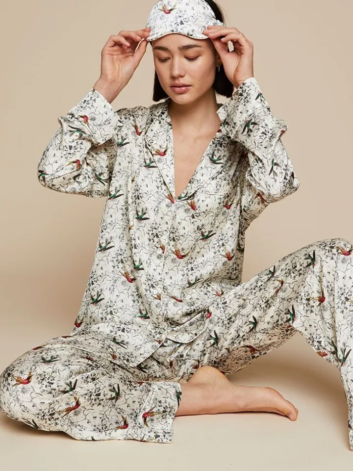Dieser Seidenschlafanzug ist in den Größen S bis L erhältlich. Das Oberteil ist geknöpft mit feinen Perlmuttknöpfen und hat lange Ärmel. Die Hose hat einen Gummibund mit Bindebändchen und seitliche Taschen.