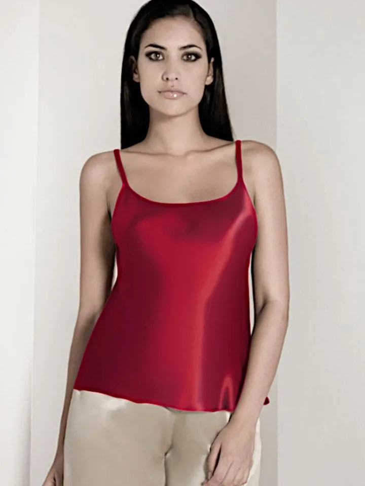 Dieses edle Seiden-Top macht als glänzendes Oberteil oder als seidiges Unterhemd eine gute Figur. Zusammen mit den separat erhältlichen Seidenshorts wird daraus ein luftiger Kurz-Schlafanzug für den Sommer. Das Top ist aus Seidensatin aus reiner Seide und hat eine Länge von ca. 65 cm. Die fein gearbeiteten, doppelten Träger sind ca. 1 cm breit und der Ausschnitt ist als breiter Rundausschnitt gestaltet.