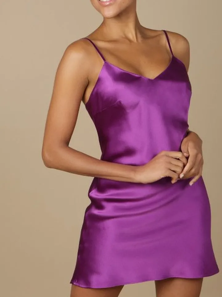 Dieses kurze Seiden-Nachthemd ist ca. 85 cm lang. Es wird in den Größen 34 bis 46 angeboten (deutsche Damengrößen) und ist in den folgenden Farben erhältlich. An der Brust hat das Nachthemd seitlich Abnäher für eine verbesserte Passform.