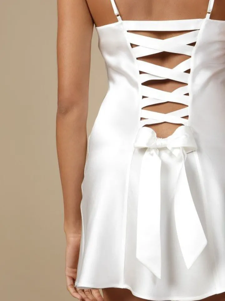 Das Highlight dieses ansonsten schlichten Nachthemdes ist die raffinierte Rückengestaltung mit überkreuzten, geflochtenen Bändern und einer großen Schleife.