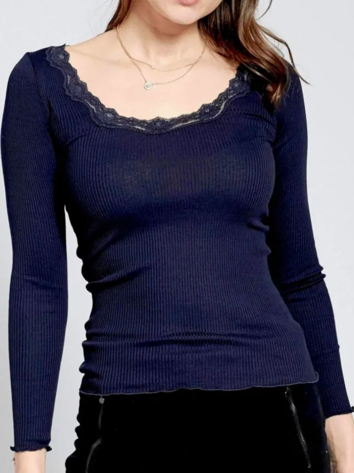 Die Hochwertigkeit des Stoffes (70% Seide, 30% Baumwolle kbA) wird durch den schlichten Schnitt und die Verzierung mit Wäschespitze (70% Polyamid, 30% Elasthan) unterstrichen. Das Shirt hat lange Ärmel und eine unkomplizierte Passform. Es kann als Oberbekleidungsteil, Unterwäsche oder auch als Nachtwäsche und Homewear getragen werden.