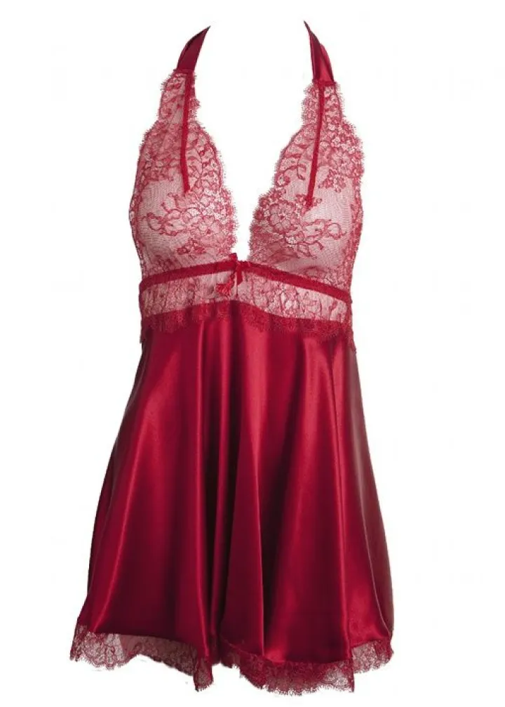 Das besonders kurze Baby-Doll aus Seiden-Satin besteht oben vollständig aus exquisiter, halb-transparenter Spitze und ist im Nacken mit einer weichen Schleife aus Seidensatin zu binden. Der Rocksaum ist schön weit geschnitten und mit Spitze besetzt. Ein kleines Schmuckelement ziert den Ausschnitt mittig. Die Gesamtlänge dieses besonders ausgefallenen Seiden- Baby-Dolls ist ca. 75 cm.