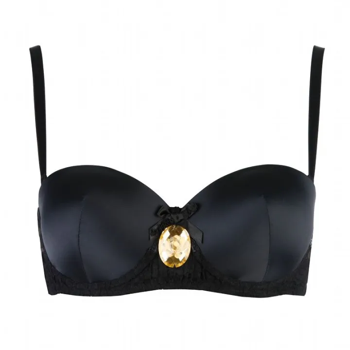 Dieser Balconett- BH besteht aus schwarzem Stretch-Satin und schwarzer Spitze. Die ausgeformten Schalen mit Bügel sind leicht geschäumt. Die elastischen Träger sind längenverstellbar. Sie können außerdem abgenommen werden, so dass der BH trägerlos getragen werden kann. Ein eingearbeitetes Haftband sorgt für Halt. Das Decolleté ziert ein Satin-Schleifchen und großer, bernsteinfarbener Medaillon-Kristall.