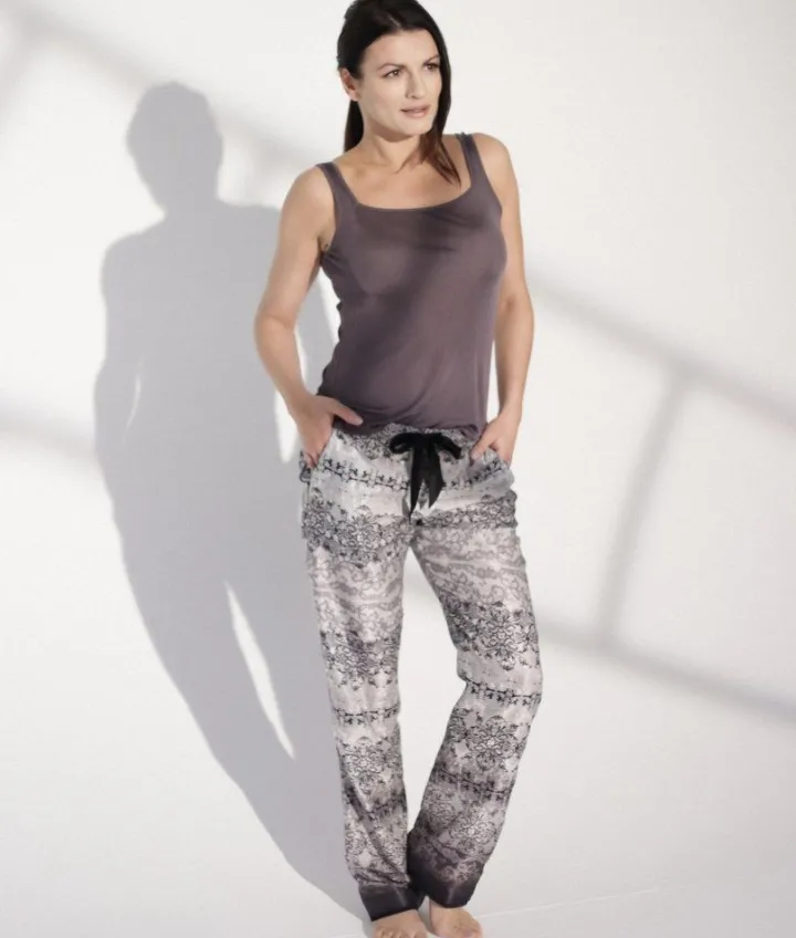 Das Hose mit Gummibund von Gattina besteht aus fein glänzendem Satin (65% Baumwolle, 35% Seide). Sie hat einen grafischen Druck in grau, schwarz und creme und ist in in den Größen 36 bis 48 (deutsche Damenkonfektionsgrößen) erhältlich. Ausverkaufte Größen sind hier nicht nachbestellbar. Diese Hose kann als Schlafwäsche, Lounge-Wear oder Sommerkleidung getragen werden.