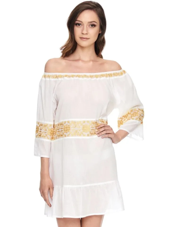 Die Tunika mit halb-langen Ärmeln von Gattina besteht aus 100% Baumwolle in einer leichten Batist-Qualität. Sie hat einen Carmen Ausschnitt und ist in in den Größen 36 bis 48 (deutsche Damenkonfektionsgrößen) erhältlich. Ausverkaufte Größen sind hier nicht nachbestellbar. Diese Tunika mit einer Gesamtlänge von ca. 80 cm kann als Nachthemd, Longbluse oder Strandkleidung getragen werden.