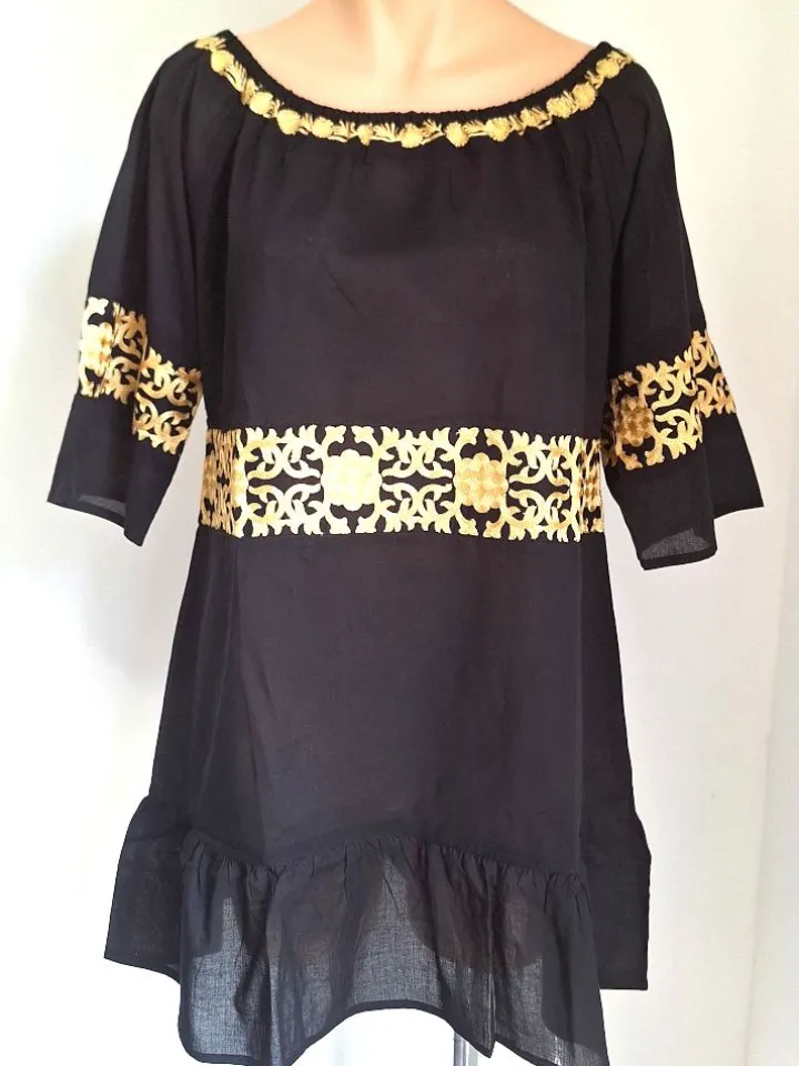 Sie hat mittellange Ärmel und ist nicht gefüttert. Breite Bordüren mit floralen goldenen Bestickungen sind im Oberteil und in den Ärmeln eingenäht. Am Saum ist ein wellig genähter Rüschenabschluss und der elastische Kragen kann auf unterschiedliche Art getragen werden. Der zeitlose Schnitt und die bequeme Passform machen aus dieser Tunika einen gemütlichen Begleiter für zu Hause oder auf Reisen. Da das Material sehr fein ist, ist diese Tunika leicht durchscheinend.