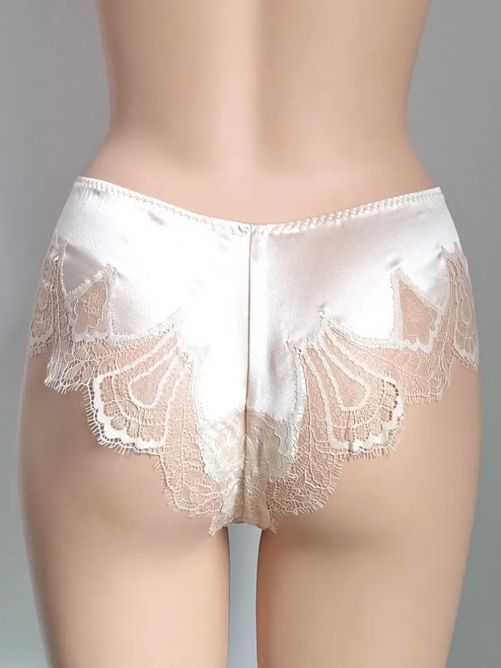 Die Culotte Freya von Cotton Club ist Seidenwäsche der Luxus- Klasse. Das edle Teil besteht aus glänzendem Seiden-Stretchsatin und exquisiter Eye-Lash Spitze. Der Seidenteil dieser Culotte besteht dabei aus elastischer Seide mit Elasthananteil, die Spitze ist aus Polyamid gefertigt. Die Culotte aus der Kollektion „The Templar Treasure“ ist im vorderen Teil aus Seidensatin gefertigt und innen mit weichem elastischen Tüll abgefüttert. Seitlich und auf der Rückseite besteht dieser Slip im Brasiliana-Schnitt zum größten Teil aus Spitze.