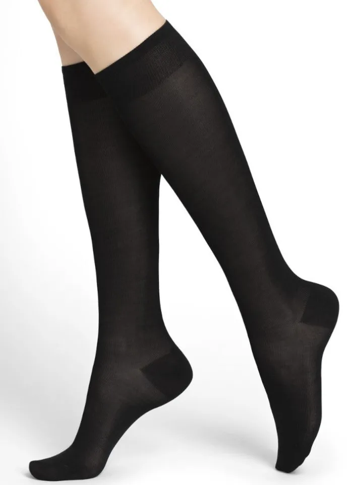 Diese langen Kniestrümpfe sind glatt und feingestrickt und in den Größe 36/38 oder 39/41 in der Farbe schwarz erhältlich.