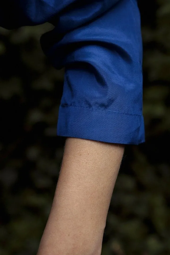 Das Material ist ein leichter und haltbarer Habutai aus 55% Seide und 45% Mako-Baumwolle der leicht und luftig ist. Das luftige Material ist atmungsaktiv, feuchtigkeitsausgleichend, angenehm auf der Haut und hat einen seidenmatten Glanz. Knitterfalten (z.B. durch das Einpacken) mildern sich im Gebrauch ab, das Gewebe ist einfach zu bügeln und nach der Wäsche trocknet das Material schnell wieder (bitte nur mit einem für Seide geeigneten Waschmittel waschen!). Durch den Anteil an sehr hochwertiger, langfaseriger Ägyptischer Baumwolle verbessert sich die Haltbarkeit und Strapazierfähigkeit des Materials bei einem geringen Gesamtgewicht.