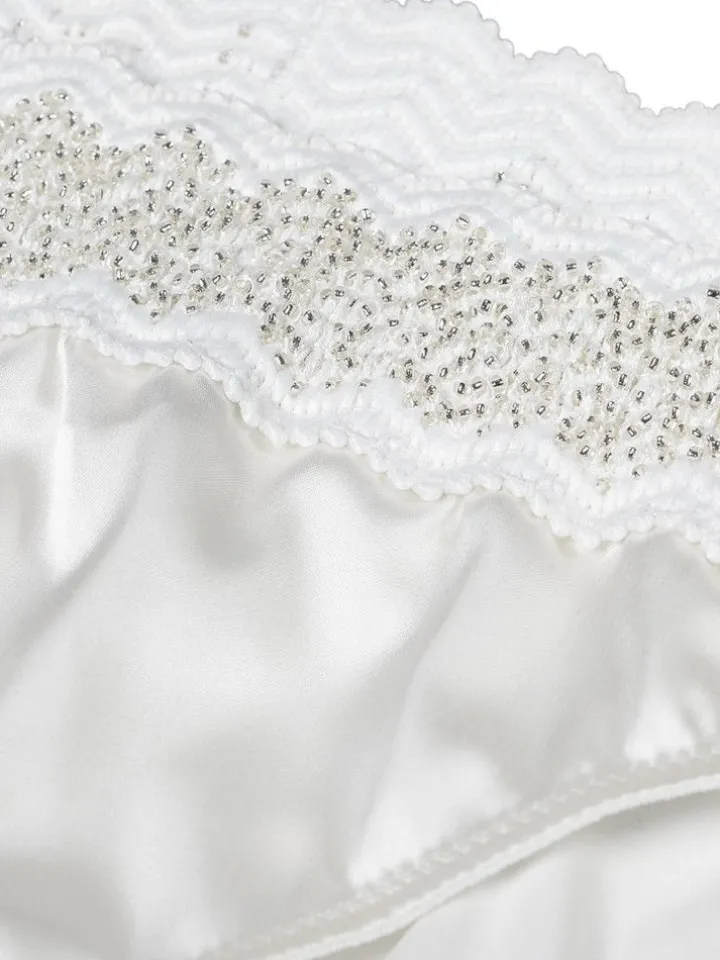 Der Satinslip Mimi Satin Ivoire Perle von Cadolle ist luxuriös und mit dem gewissen Etwas… Der Slip mit breitem Bund besteht aus elastischem, glänzendem Satin und hat eine üppige Zierperlenbestickung am Bund umlaufend. Der Culotte Slip ist ungefüttert und hat einen Innenzwickel aus Baumwolljersey. Er hat elastische Bündchen.