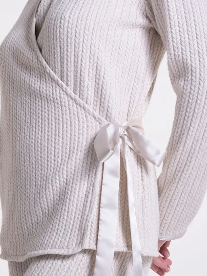 Der Lounge-Anzug hat lange Ärmel. Das Oberteil wird gewickelt getragen, mit einem Bindegürtel geschlossen und die Hose hat weite Beine und einen Gummibund. Der Anzug ist eine wärmende Loungewear für jede Jahreszeit kann aber auch als Tagbekleidung in verschiedenen Kombinationen getragen werden. Er ist bei uns in der Farbe wollweiß meliert erhältlich.