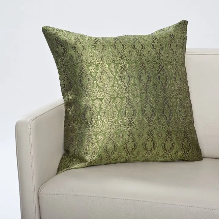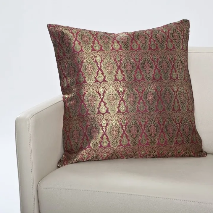 Die Zierkissen-Hülle Madras aus handgewebtem Seidenbrokat bietet hat ein besonders ausdrucksstarkes, klassisches Muster. Seidenbrokat ist die besonders reiche Weiterentwicklung des Jacquards. In das detaillierte Muster wurden dekorative metallisierte Fäden eingewoben. Das Gewebe besteht aus 75% Seide und 25% metallisiertem Garn.