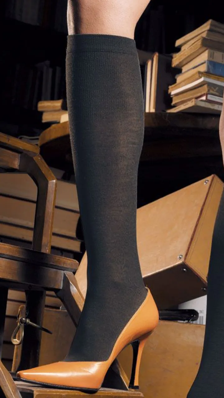 Der Kniestrumpf Jennifer von Trasparenze ist durch den hohen Anteil Merino-Wolle besonders weich und wärmend. Diese edle Strumpfqualität wird daher auch von empfindlichen Hauttypen gut vertragen.