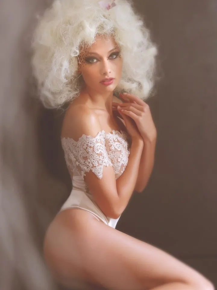 Der Satin Stringbody von Prelude Milano ist Lingerie Made in Europe. Das edle Teil besteht aus glänzendem Stretchsatin in einem exquisiten goldcreme und einer transparenten, bestickten Tüllspitze. Der Body hat einen weiten Carmen Ausschnitt und kurze Ärmel. Im Rücken ist eine zierende Knopfreihe angebracht. Der Body hat einen seitlichen Reißverschluss und kann unten hinten geöffnet werden.