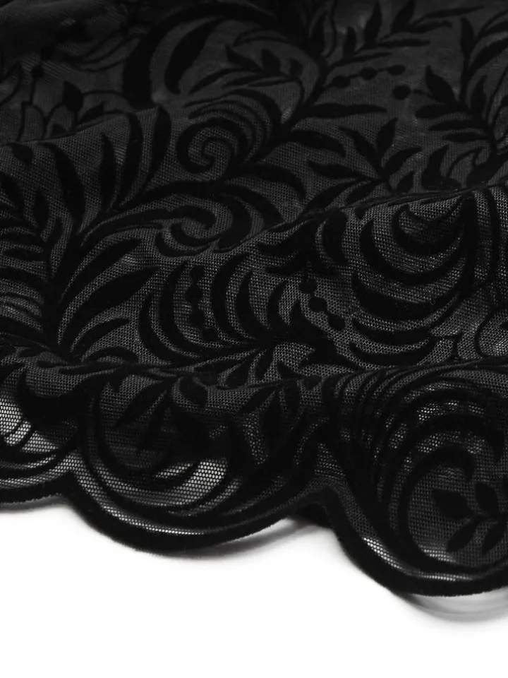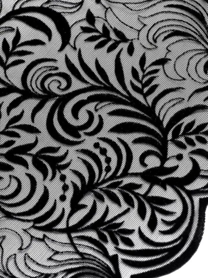 Der Tüllbody Arabesque von Cadolle ist ein eleganter Hauch von Nichts… Der Langarm Body besteht aus feinem Pünktchen Tüll mit einem arabequen Flockdruck-Muster. Der Body ist ungefüttert und daher transparent. Er hat lange Ärmel, ein platziertes Muster aus samtigem Flockprint, einen weiten Carmenausschnitt und wird im Schritt mit Druckknöpfchen geschlossen.