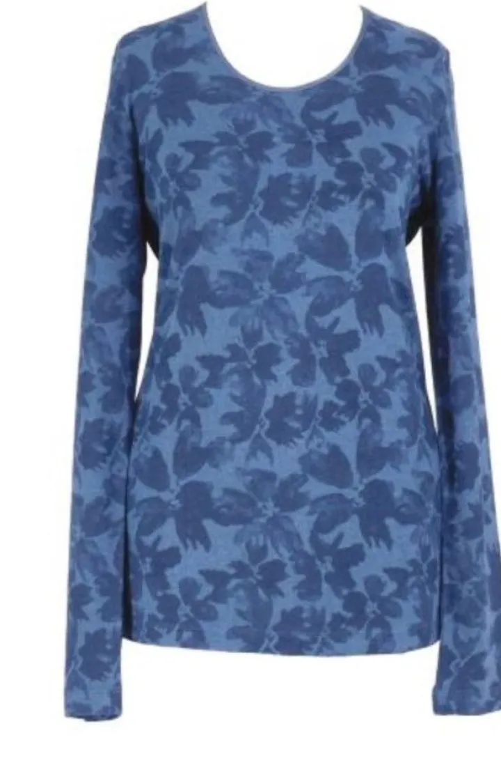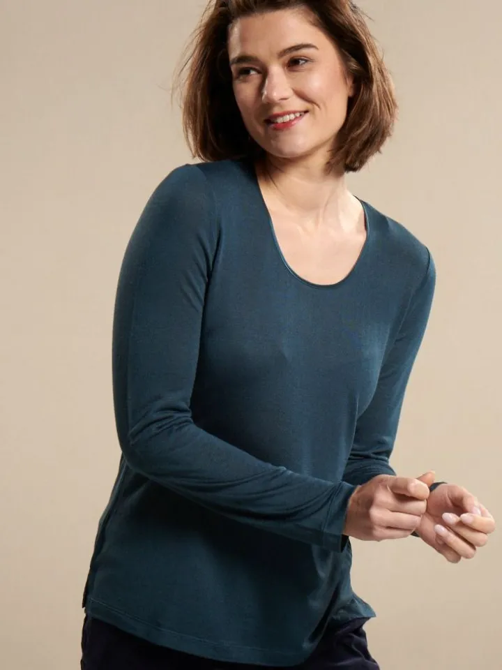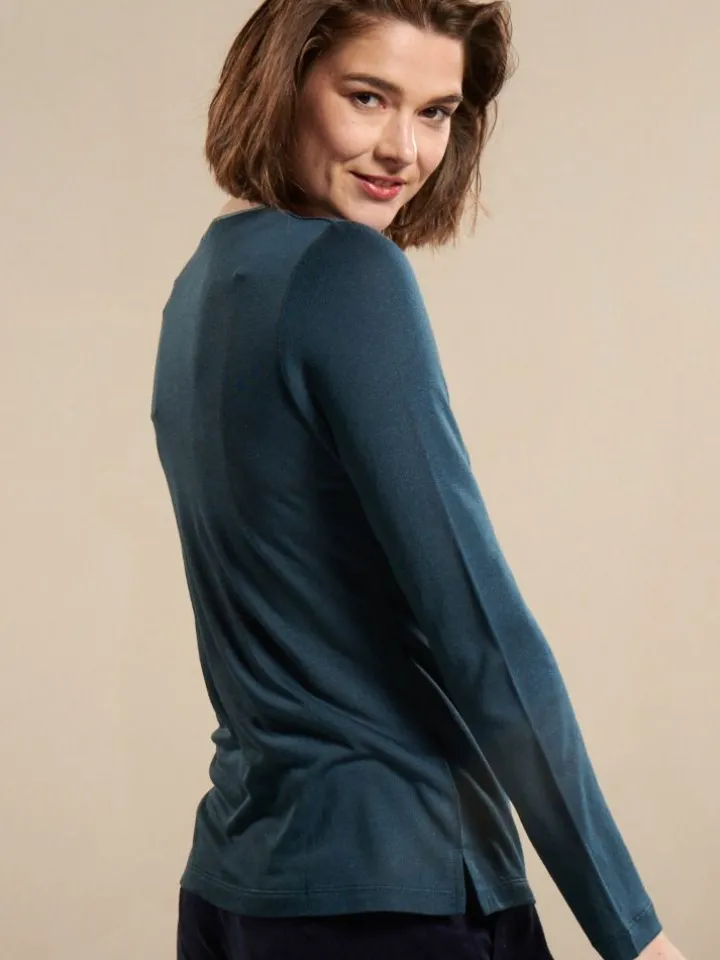 Die Hochwertigkeit des Stoffes mit einem Seidenanteil von 30% und 21% Leinen wird durch den schlichten und eleganten Schnitt unterstrichen. Das Shirt hat lange Ärmel und eine unkomplizierte Passform. Am Saum ist es beidseitig ca. 5 cm hoch geschlitzt. Der Rundhalsauschnitt ist mit glänzendem Satin aus Seide eingefasst. Dieses Seidenshirt ist perfekt für den Schichten-Look im Herbst und Winter und kann als Oberbekleidungsteil oder auch als Homewear getragen werden.