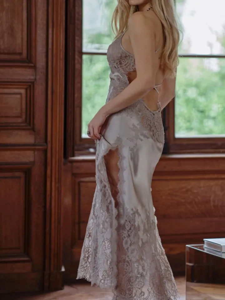 Das lange Seidenneglige Venus der französischen Edel-Marke Marjolaine ist aus eleganter Seide (100% Seide) gefertigt. Das glatte, in leichter A-Linie geschnittene Nachthemd hat verstellbare Spaghetti-Träger und beidseitig hohe Schlitze im Saum. Dieses Nachtkleid hat einen tiefen Rückenausschnitt.
