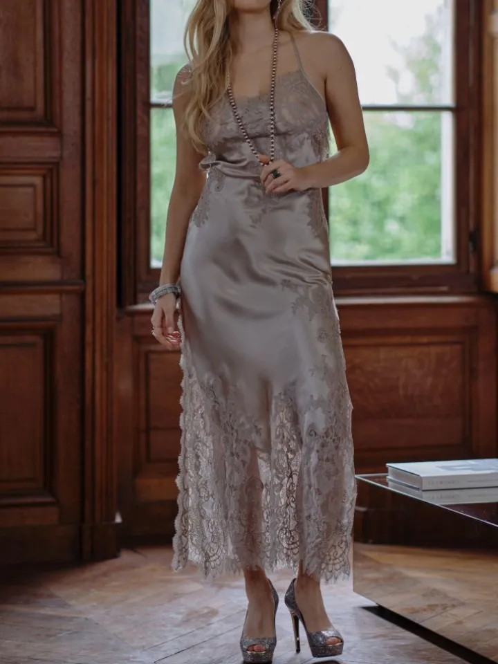 Dieses lange Seidennachthemd hat einen üppigen Besatz mit feiner Blumenspitze am Decolleté und am Saum. Es ist ca. 140 cm lang und wird in den Größen 36 bis 42 angeboten (deutsche Damengrößen). Bei uns ist dieses Neglige in einem schönen Kieselgrau erhältlich. Da dieses Neglige zu einer modischen Kollektion von Marjolaine und deswegen sind ausverkaufte Größen leider nicht nachbestellbar.