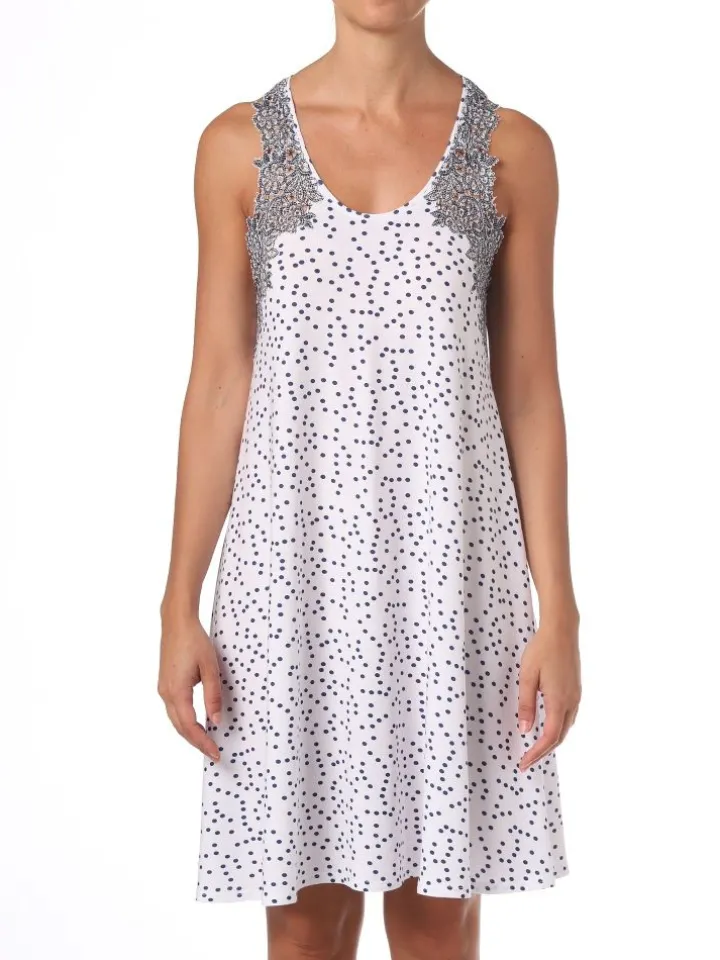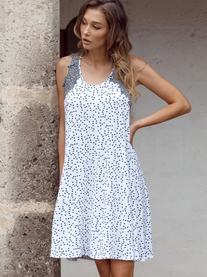 Das Nachthemd Cecilia hat breite Träger (nicht verstellbar). Das Grundmaterial ist allover mit fröhlichen, ovalen Punkten bedruckt und die Träger sind vorne mit einer bestickten Spitze benäht. Die Länge beträgt ca. 95 cm.
