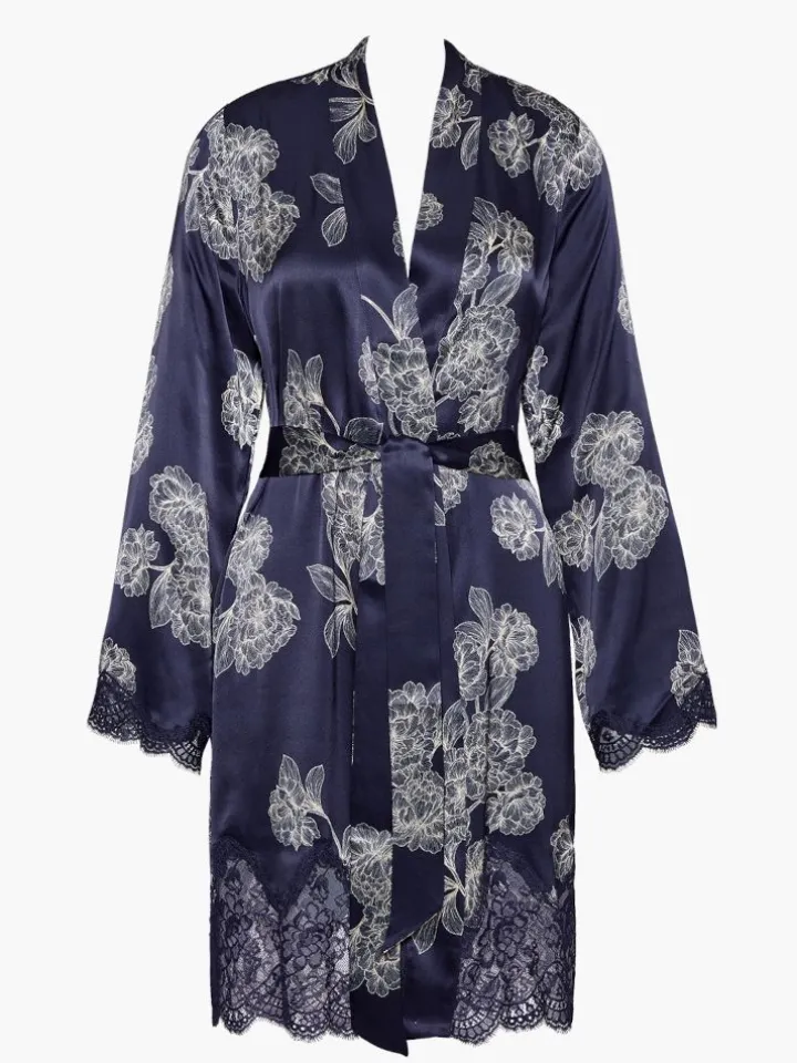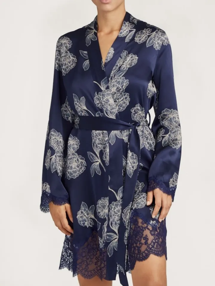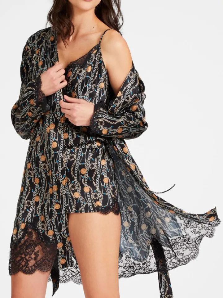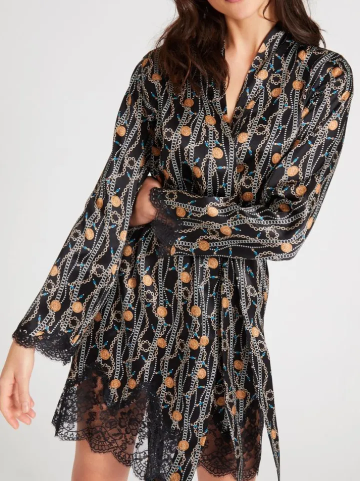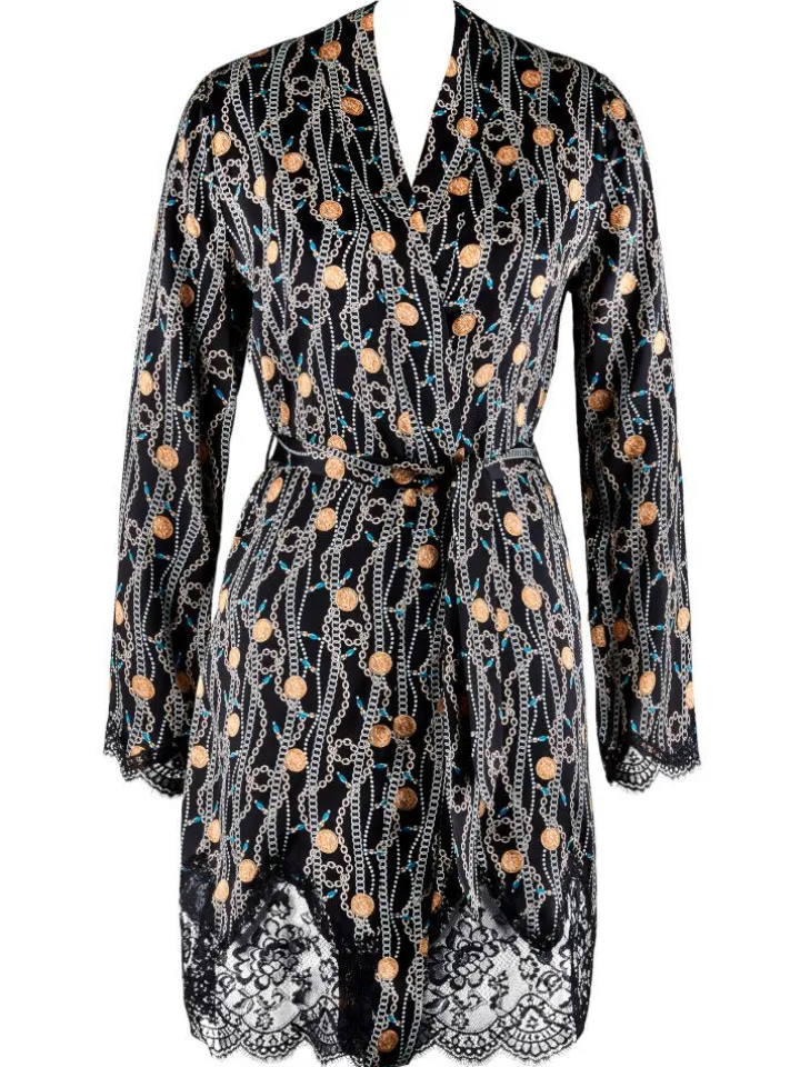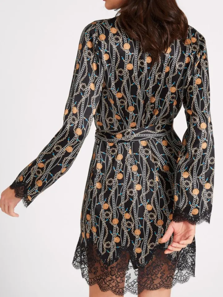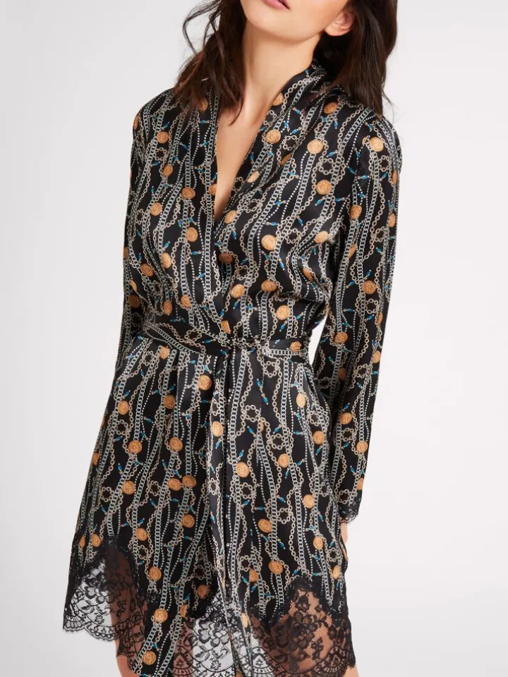 Der Seiden-Kimono Toi Mon Amour von Aubade ist eine luxuriöse Seidenwäsche mit verführerischem Blumen- oder Kettenprint. Der edle Seiden Morgenmantel besteht aus glänzendem Seidensatin (100% Seide) mit Musterdruck und Spitze.