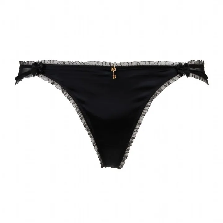 Dieser String besteht auf der Vorderseite aus schwarzem Stretch-Satin und auf der Rückseite aus schwarzem Tüll. Die Abschlüsse sind verspielt mit einem welligen Tüllband benäht. Die Vorderseite zieren zwei kleine, schwarze Schleifchen und der „Escora-Schlüssel“. Der String ist in den Größen 38-42 erhältlich.