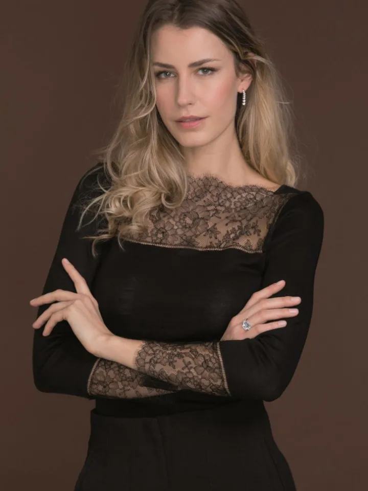 Merinowolle-Seide Langarm Shirt Barchetta schwarz von Artimaglia