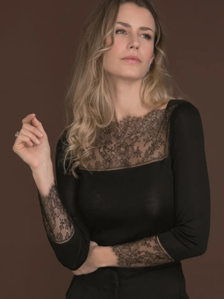 Das Barchetta Shirt Wolle-Seide besteht aus einem besonders hochwertigen glatten Jersey aus 70% extrafeiner Merinowolle und 30% Seide in Kombination mit einer exklusiven französischen Caudry Spitze. Dieses edle Shirt hat lange Ärmel, eine Gesamtlänge von ca. 60 cm und einen weiten U-Boot Ausschnitt. Das Decolleté und die Ärmelenden sind mit Blüten-Spitze gestaltet.
