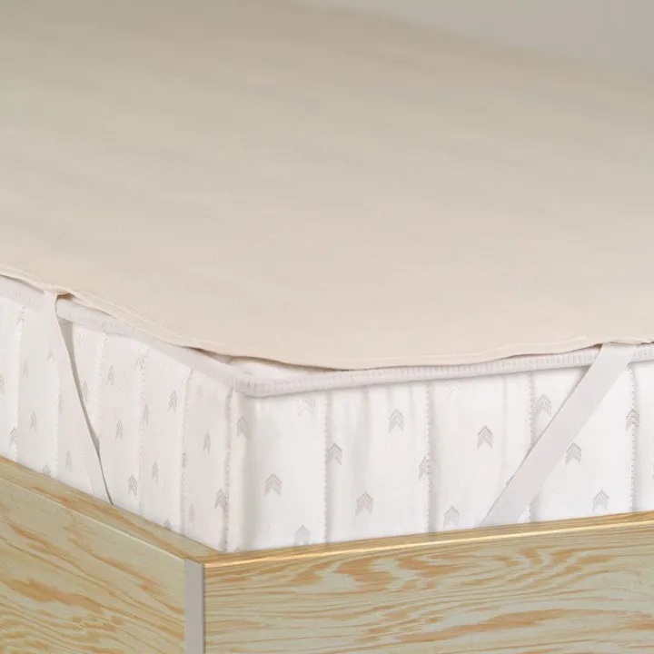 Kochfeste Kalmuck-Matratzenauflage aus gerautem, sanforisierten Baumwoll-Molton mit Spanngummibändern. Diese 95°C waschbare Matratzenauflage ist atmungsaktiv, unbeschichtet und bietet einen natürlichen und pflegeleichten Schutz für hochwertige Matratzen. Das doppelschichtige Baumwollgewebe aus 100% Bio-Baumwolle in Kalmuck-Bindung ist geraut, sanforisiert und creme-weiß. Die Ränder sind mit Baumwoll-Schrägband eingefasst und die Unterlage hat ein Flächengewicht von ca. 350 g / m².