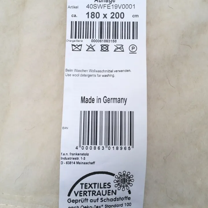 Das Lammflor Unterbett stammt aus einem Sonderposten / Restposten des deutschen Bettwaren Herstellers f.a.n. Frankenstolz und wird in schlichter Folienverpackung geliefert (leichte Beschädigungen an den Verpackungen möglich). Die Auflagen werden in Deutschland hergestellt und sind ÖkoTex100 schadstoffkontrolliert. Diese Auflage ist nicht waschbar – zur Pflege wird regelmäßiges Lüften und ggf. chemische Reinigung empfohlen. Erhältlich so lange der Vorrat reicht.