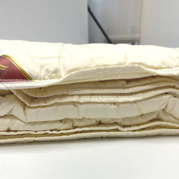 Die Decke hat eine Zylinderartige-Steppung und eine umlaufende Randrolle, welche seitliche Kälteeinbrüche verhindert. Außerdem ist die Decke schadstoffkontrolliert und zertifiziert nach ÖkoTex100 und waschbar bis 40°C (mit Wollwaschmittel im Wollwaschgang).
